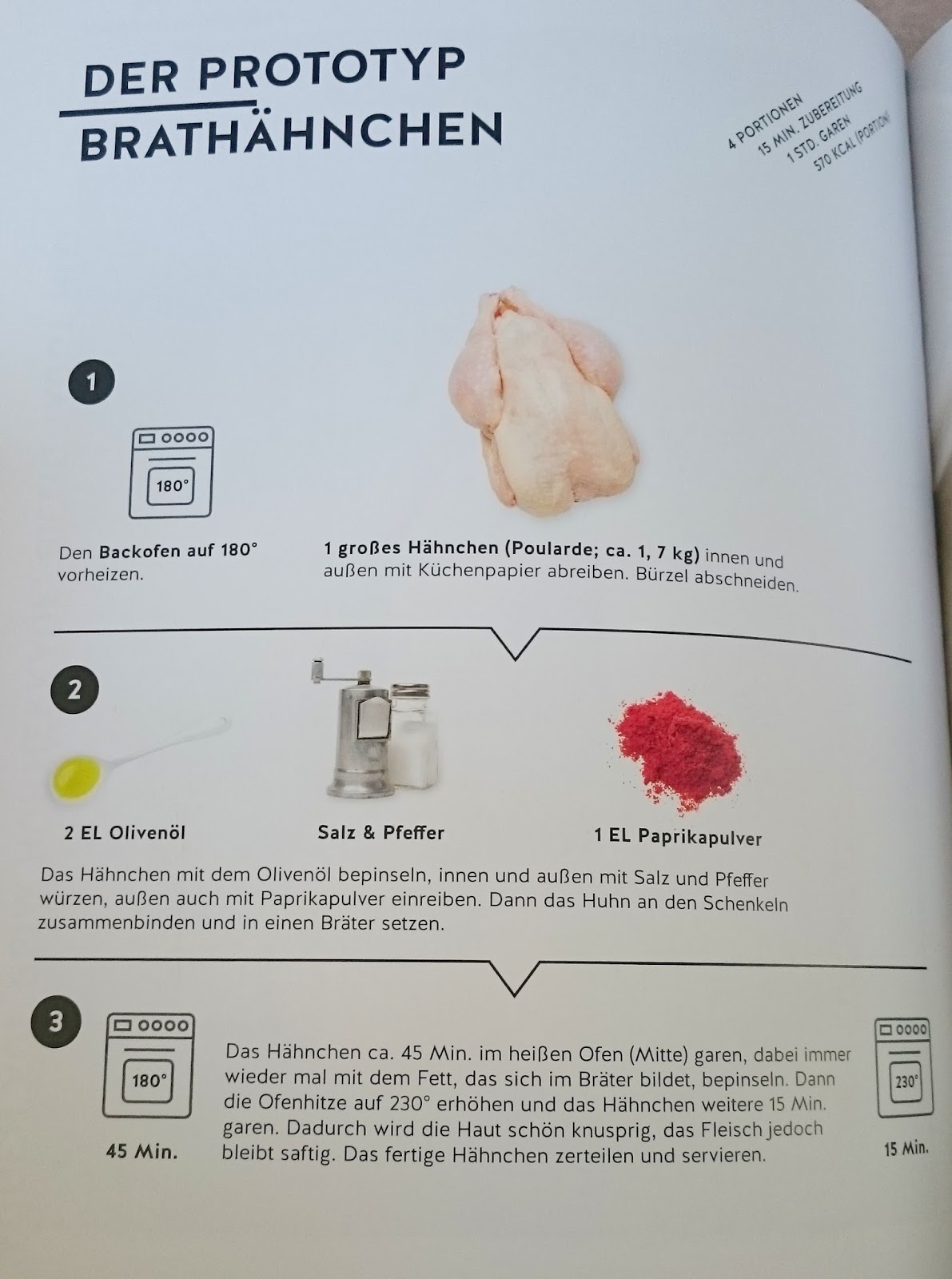 Das Buch und all diese Erklärungen rund um Gerichte, Grundrezepte und Hilfsmittel in der Küche, erinnert mich an das Lehrbuch, dass ich in meinem Berufsgrundschuljahr Hauswirtschaft hatte. Allerdings wird dieses Buch bunter und irgendwie freundlicher und übersichtlicher.
